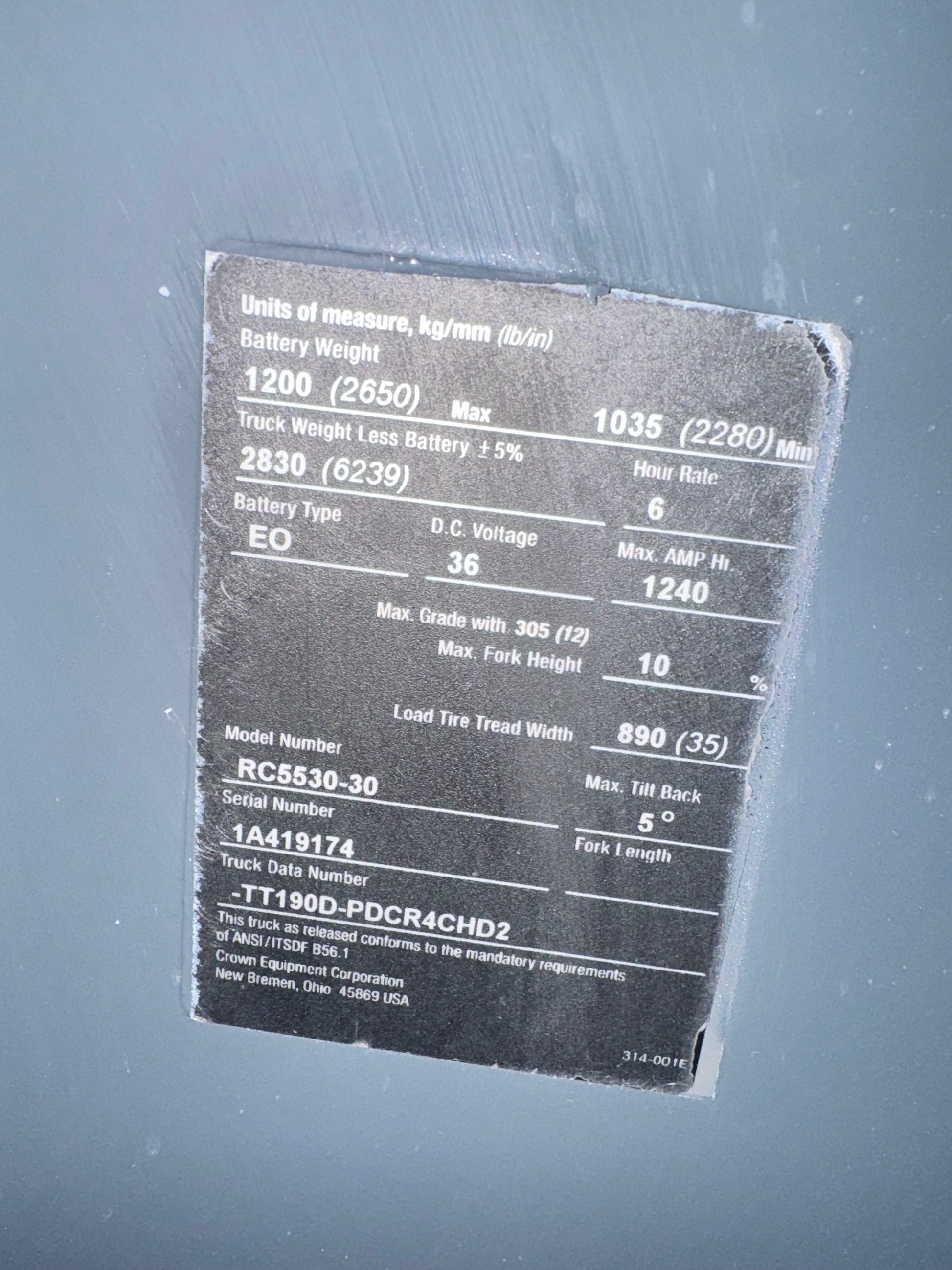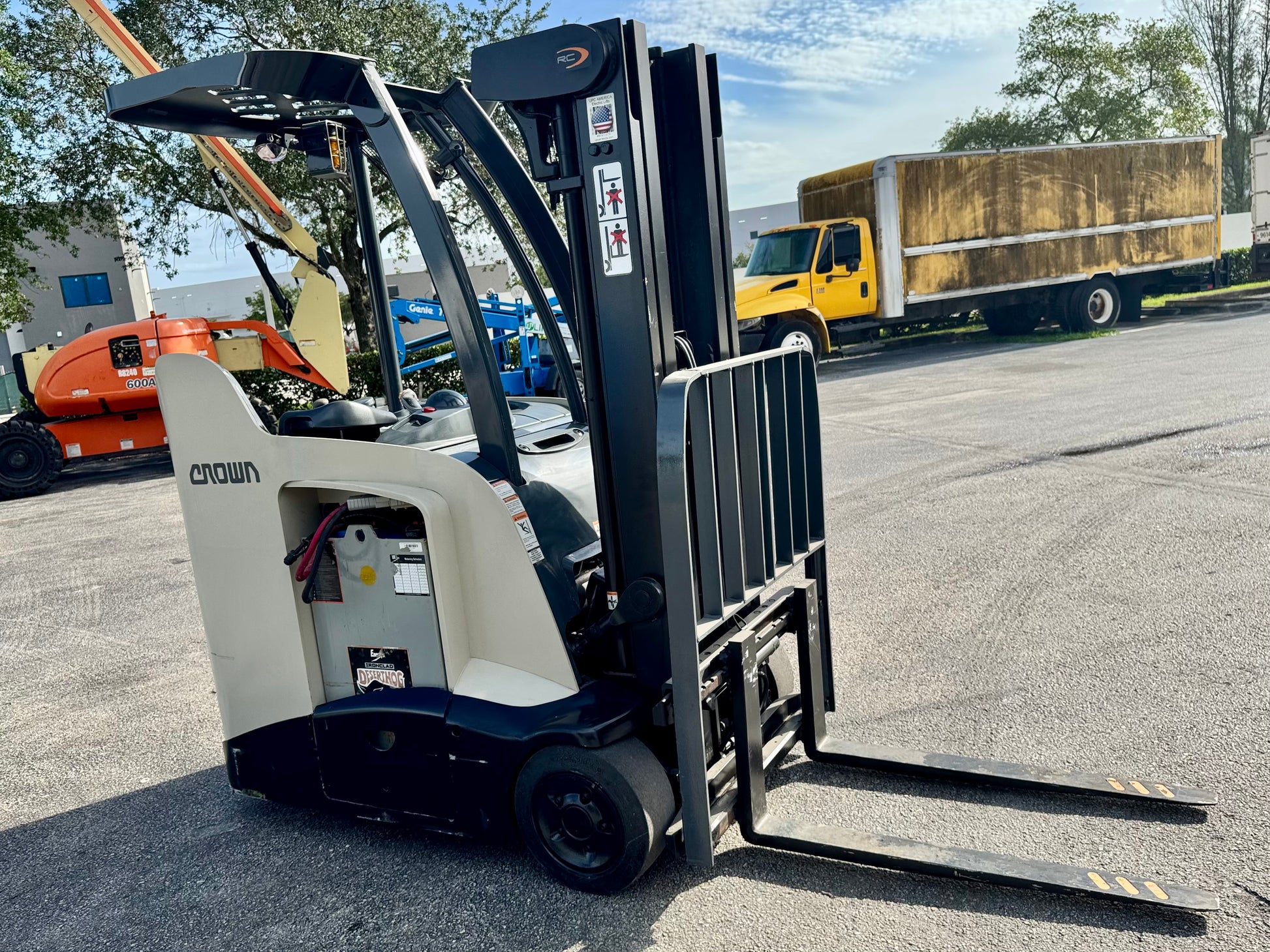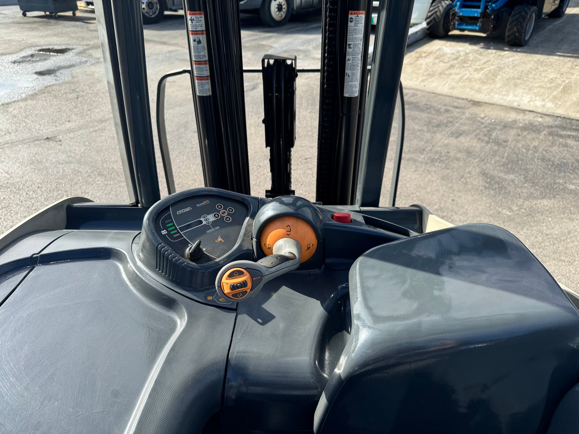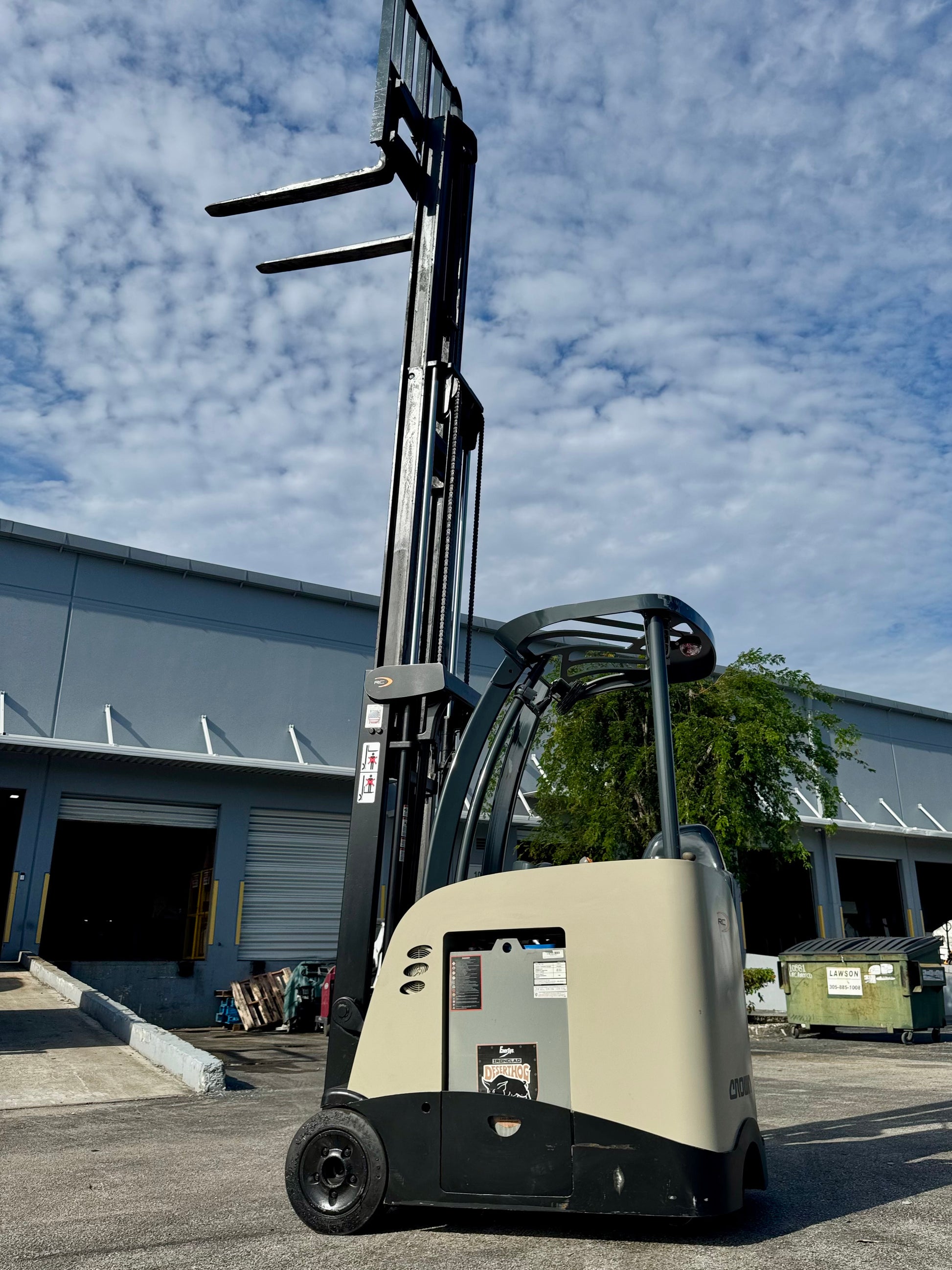 2014 Crown Electric Forklift, Triple Mast 190" Height, 36 volt 2020 Load Tested Enersys Battery, 3,000 Lbs capacity, side shift, tilt, fan, and solid tires.