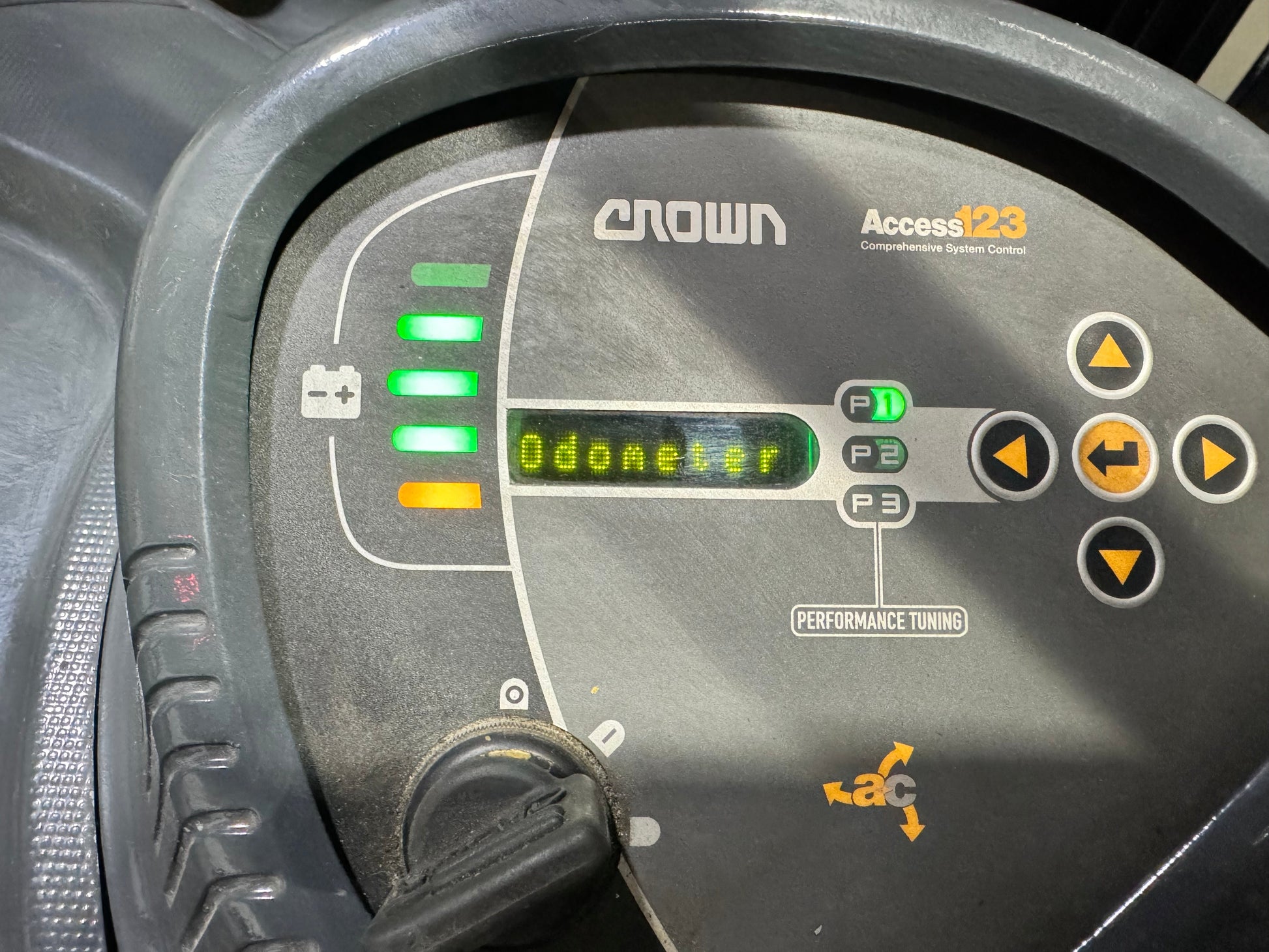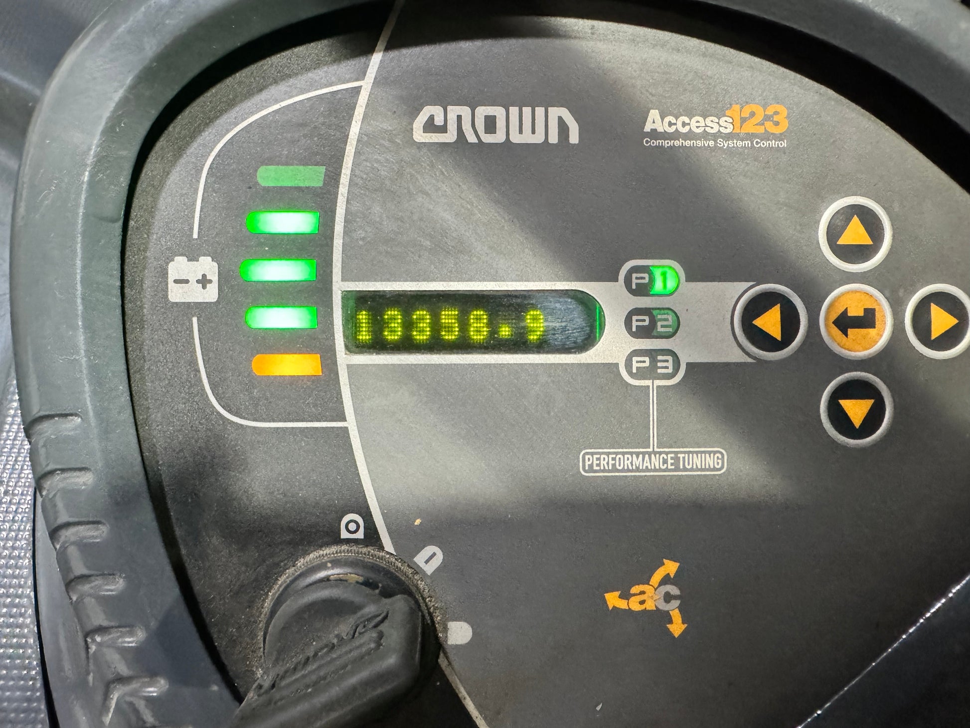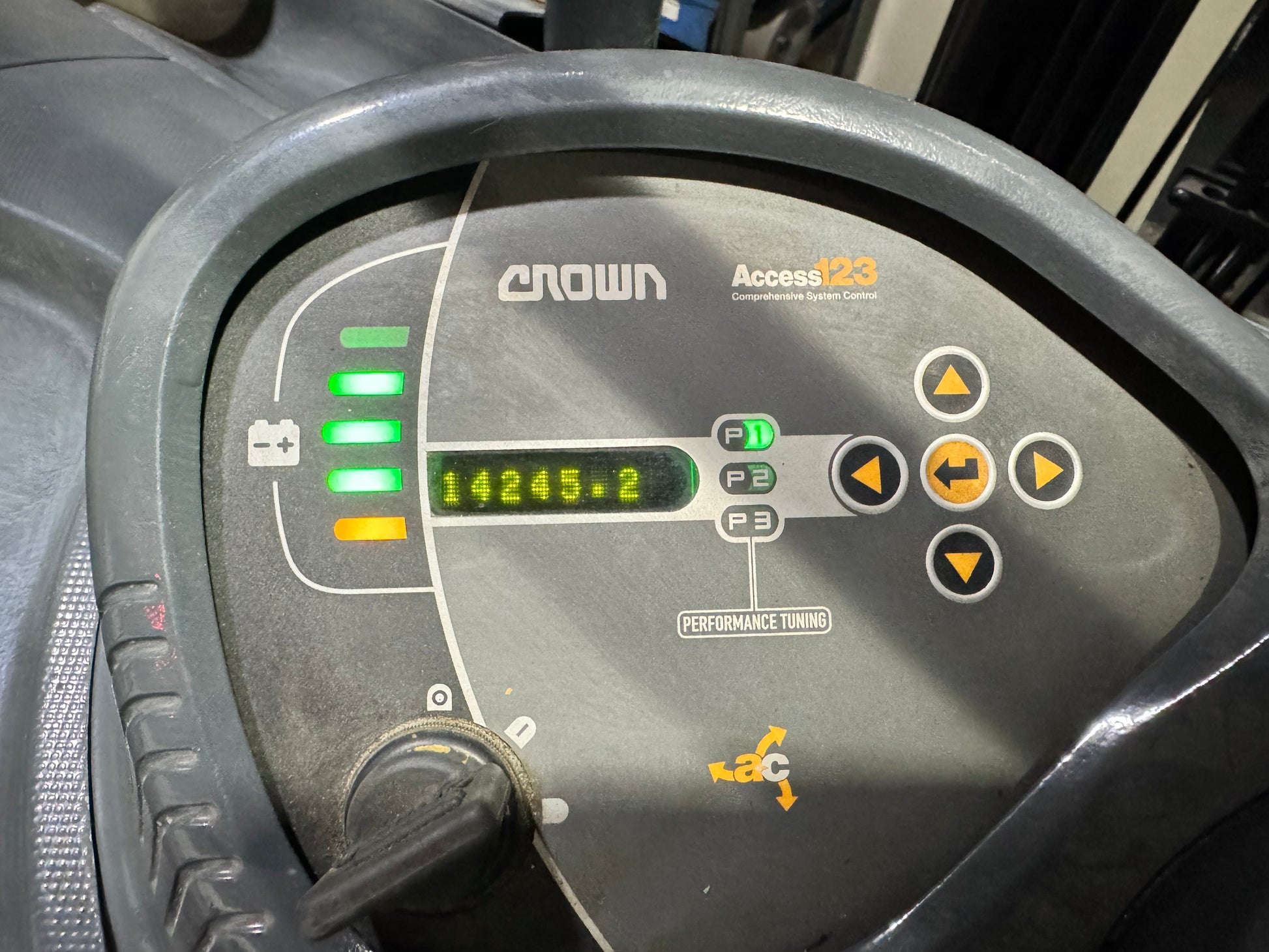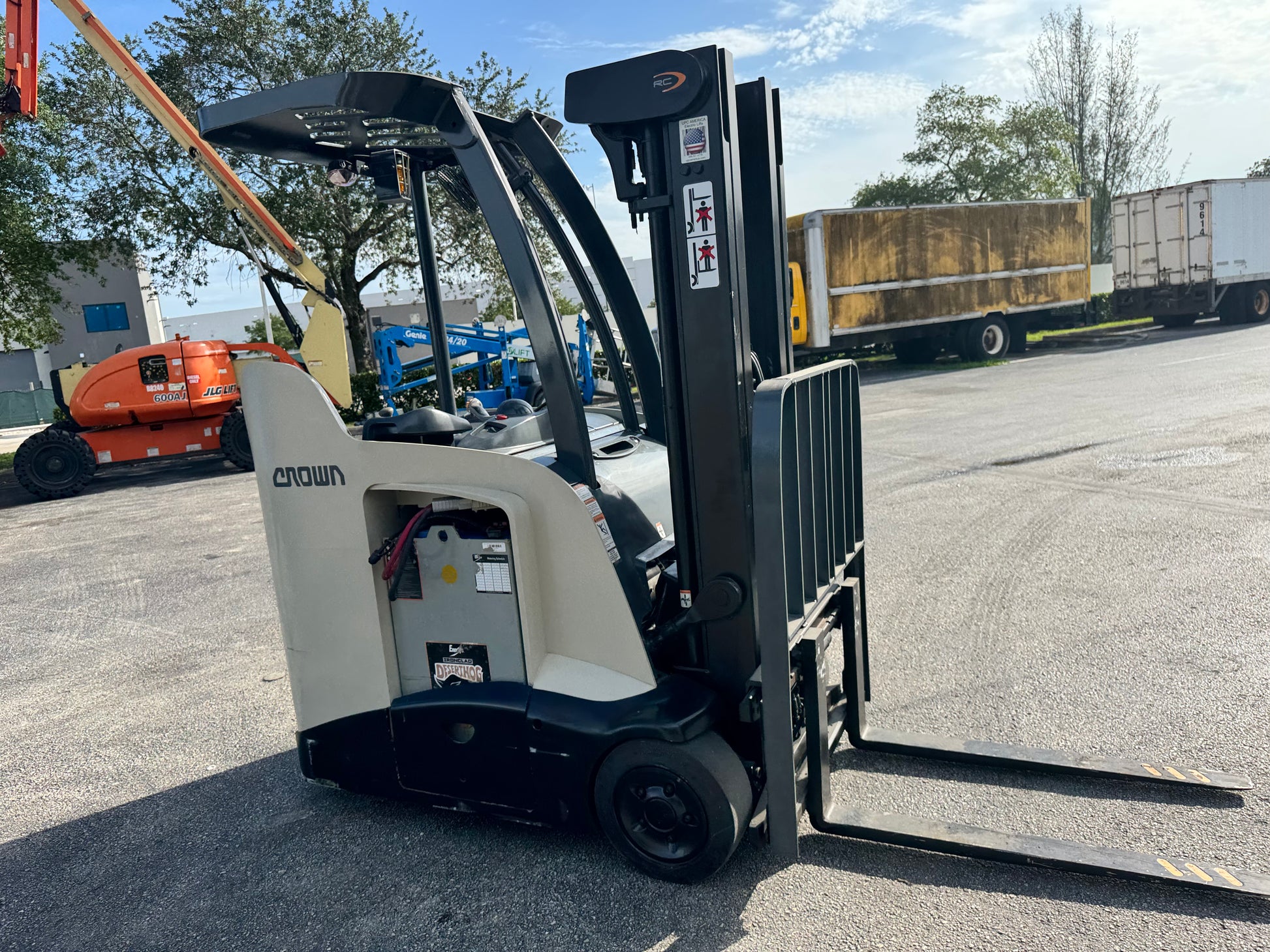 2014 Crown Electric Forklift, Triple Mast 190" Height, 36 volt 2020 Load Tested Enersys Battery, 3,000 Lbs capacity, side shift, tilt, fan, and solid tires.