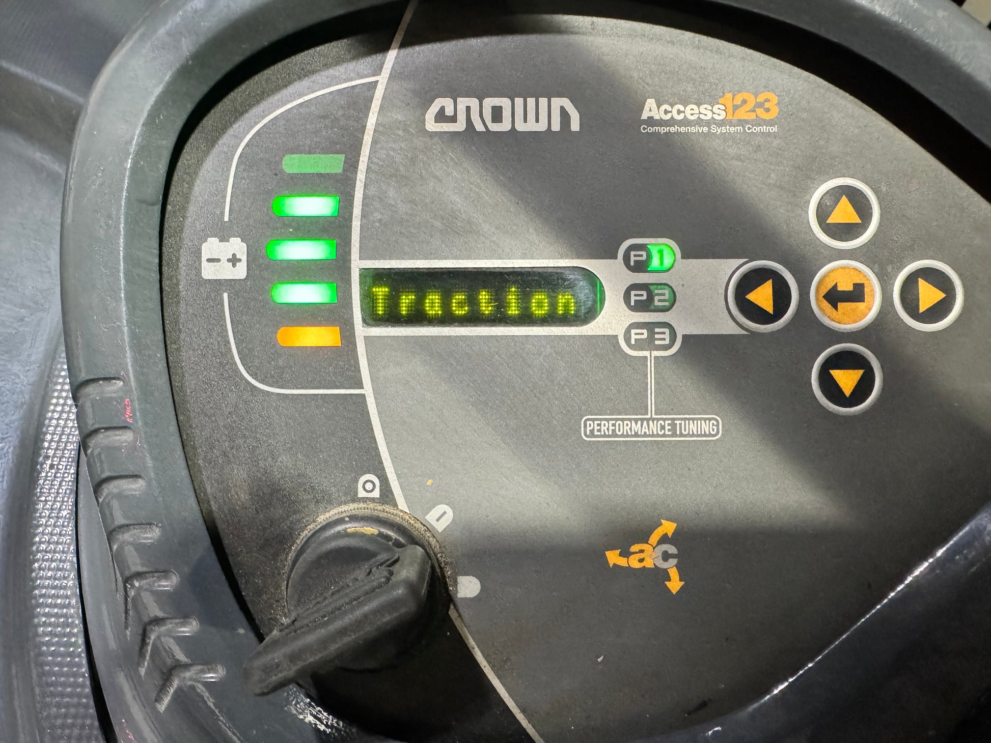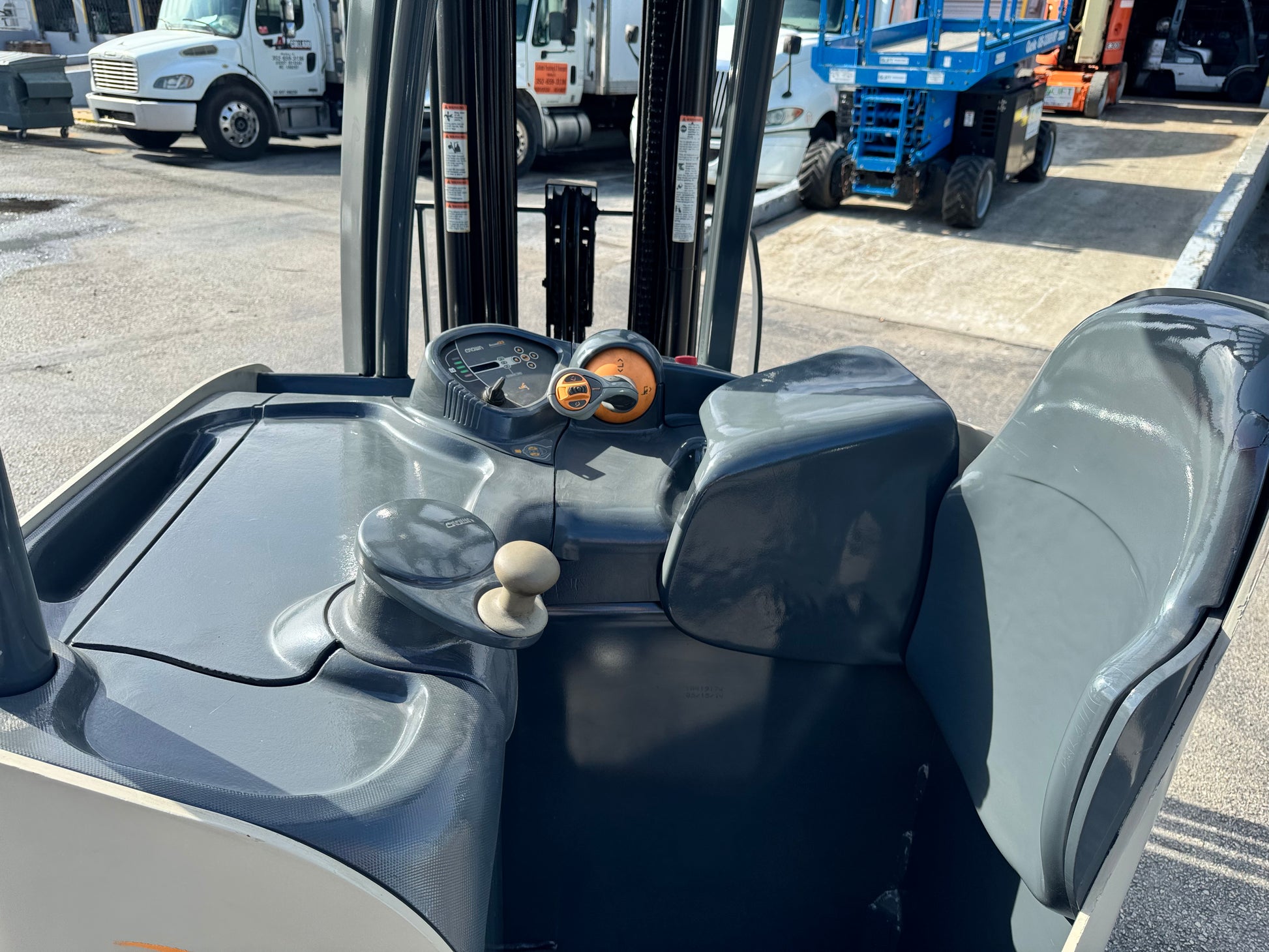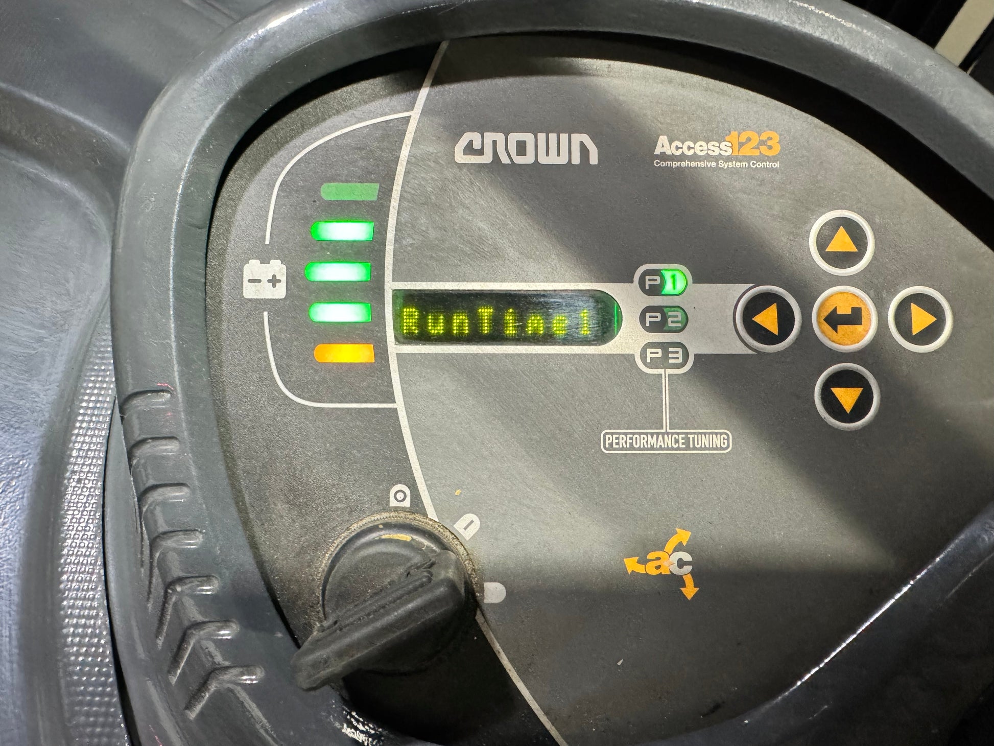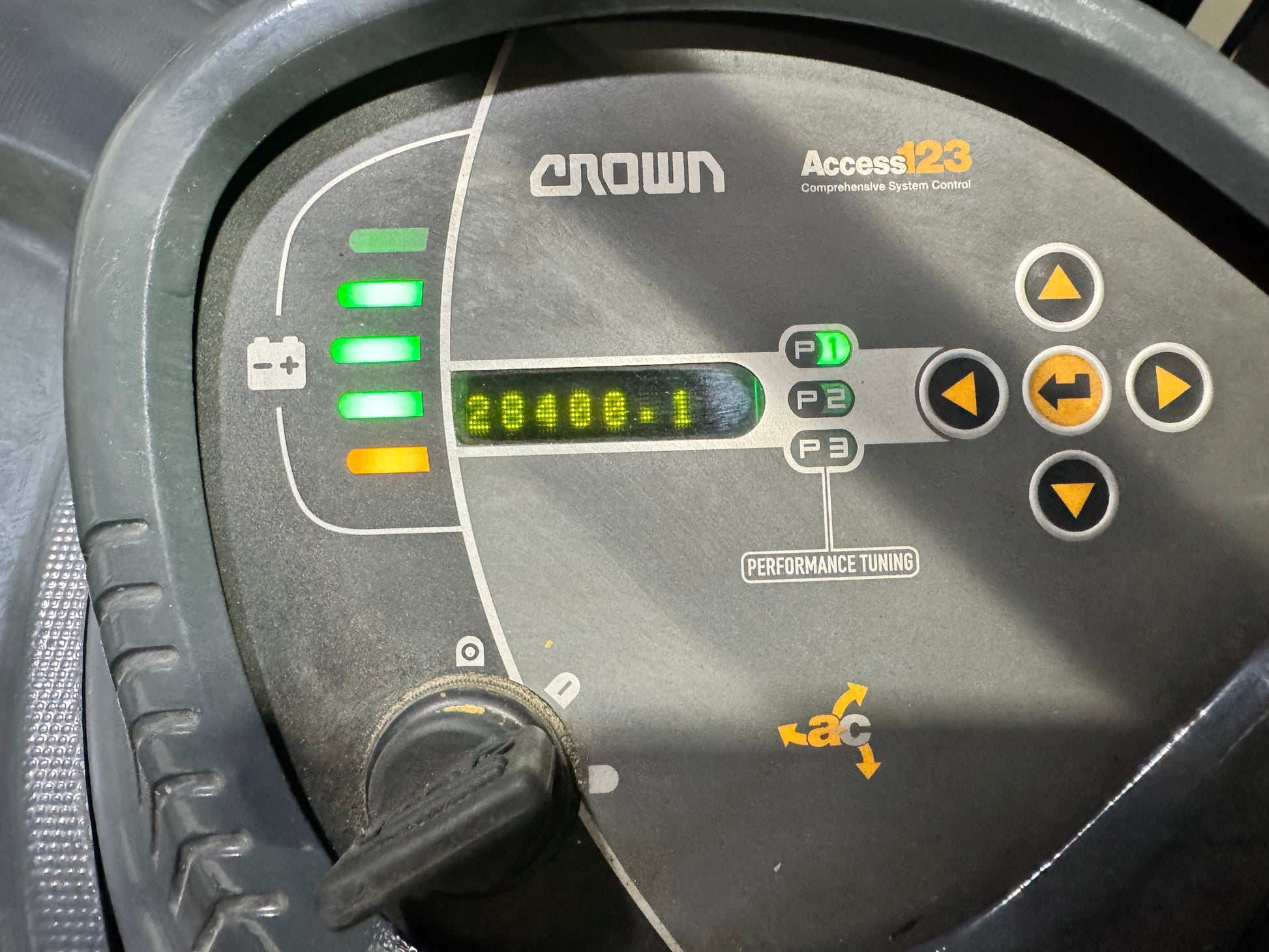 2014 Crown Electric Forklift, Triple Mast 190" Height, 36 volt 2020 Load Tested Enersys Battery, 3,000 Lbs capacity, side shift, tilt, fan, and solid tires.