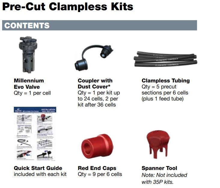 Essential Forklift Battery Maintenance Single Point Watering SystemFlow-Rite for 18 cell GNB batteries. (Flat plate, Liberator, and Tubular)Includes:Millennium Evo Valve Qty = 1 per cellCoupler with Dust Cover* Qty = 1 per kit up to 24 cells, 2 per kit after 36 cellsClampless Tubing Qty = 5 precut sections per 6 cells (plus 1 feed tube)Quick Start Guide included with each kitRed End Caps Qty = 9 per 6 cellsRegulated hose supply with 20' hose | Flow-Rite Battery Watering Systems BK-1CC-G00-518